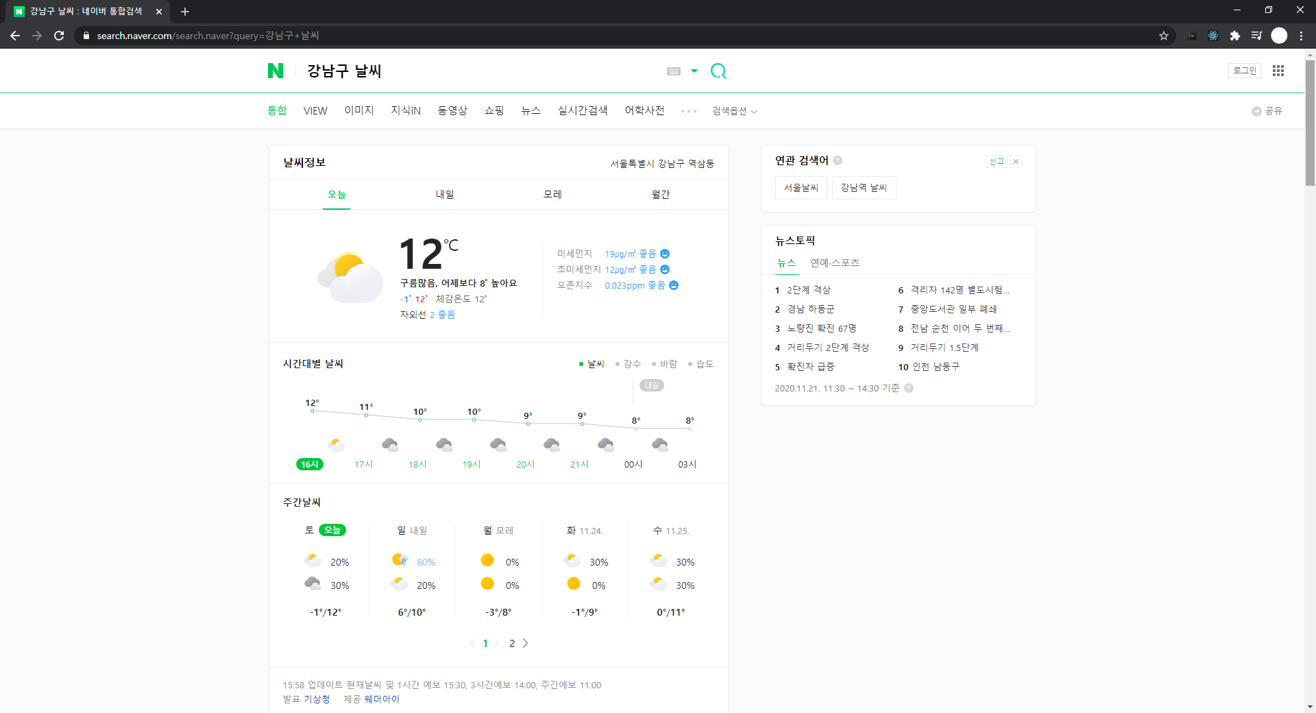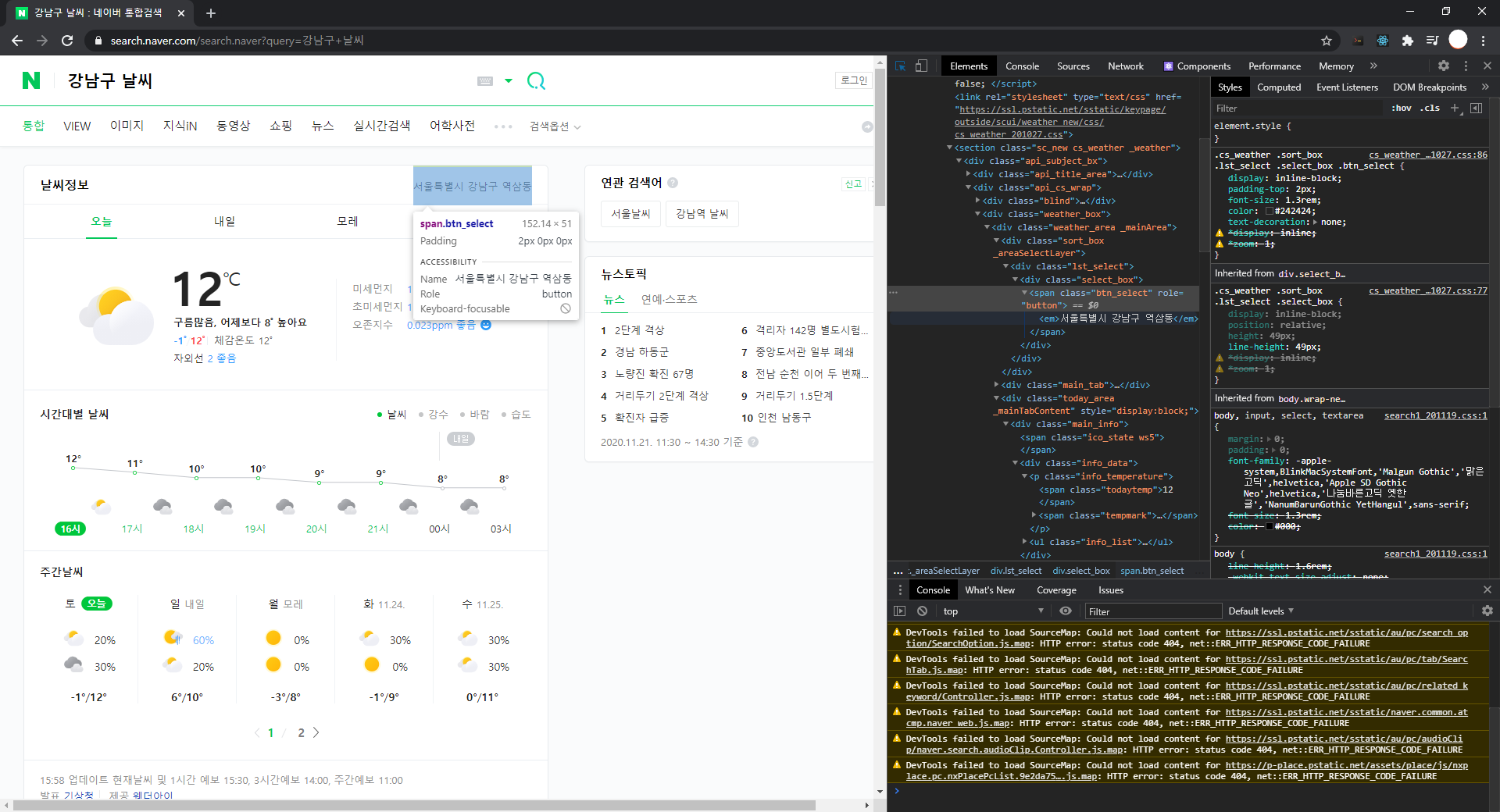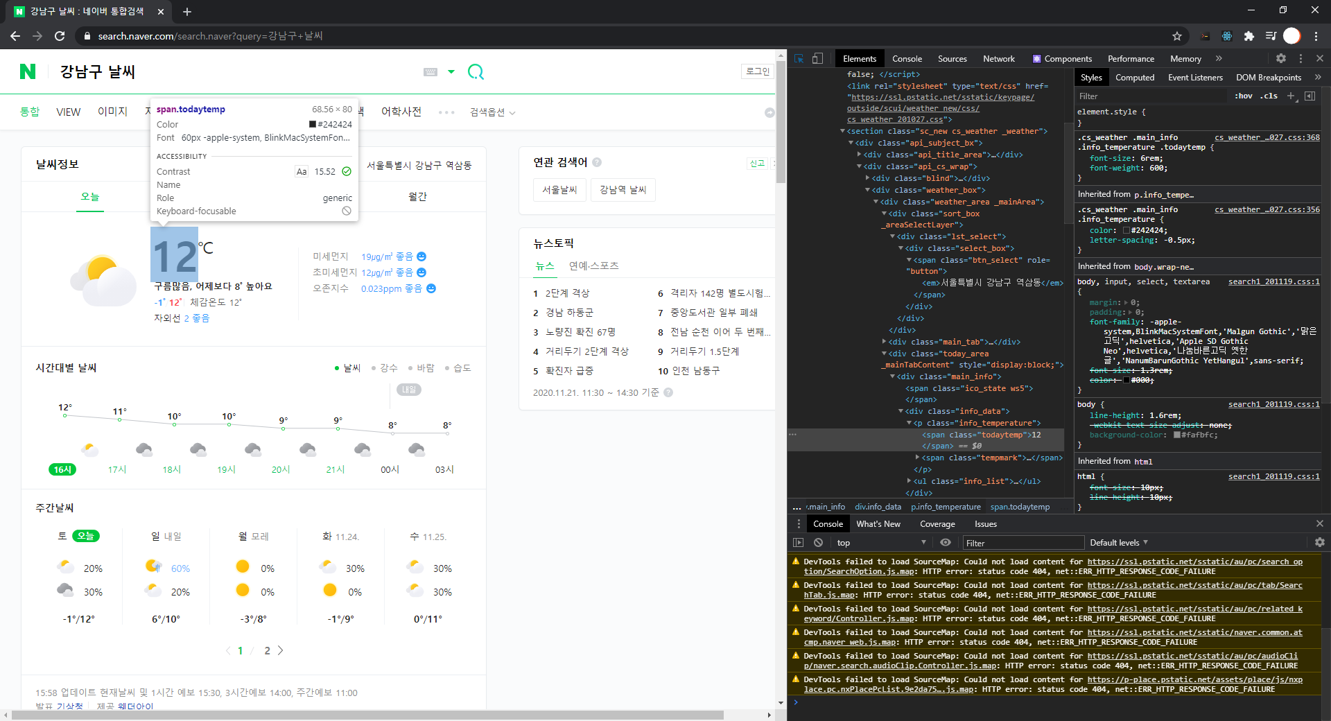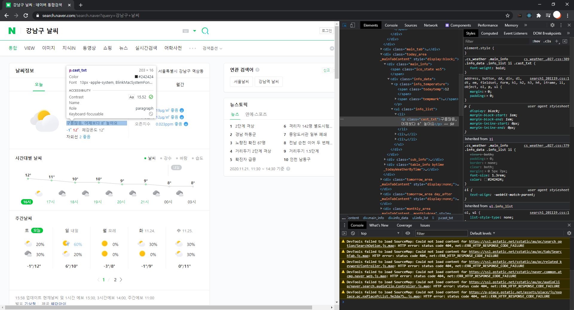 우리가 필요한 값은 날씨 정보 오른쪽에 있는 "서울특별시 강남구 역삼동"과, 아래 "12℃", 그리고 그 위에 적혀있는 문구를 가져와 보도록 하겠습니다.