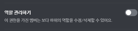 이처럼 역할을 통해서 구할수 있는 것들을 모두 작성해봤습니다. 이제 역할을 유저에게 부여하는 법에 대해 알아봅시다. 역할 부여를 하기 전에는 역할 관리에 대한 권한이 필요합니다.